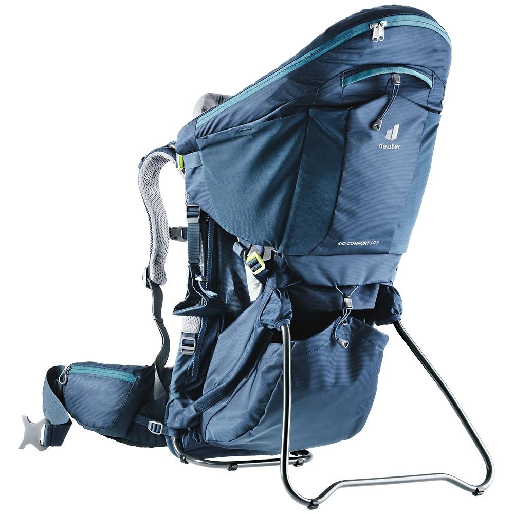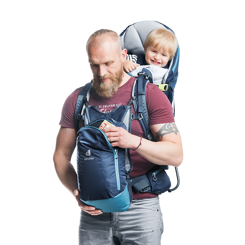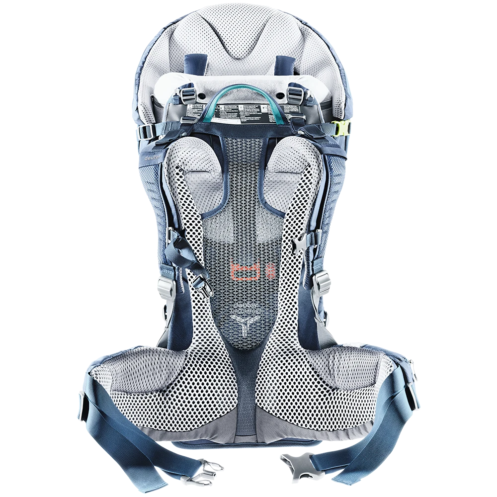 Die Profi-Kinderkraxe punktet mit einem integrierten, separat nutzbaren Daypack für den schnellen Einsatz am Wickeltisch, dem fest verbauten Sonnendach und einem Spiegel für den schnellen Blick zum Passagier im Rücken. Die Last wird mit dem neuen Aircomfort Sensic Vario Netzrücken System perfekt übertragen, die Kindertrage sitzt kompakt – und trotzdem wird der Rücken voll belüftet. Das große, weiche Kissen fängt den müden Kinderkopf auch in den Ecken der Kraxe sanft ab. Der seitliche Einstieg und das gut erreichbare Gurtsystem sorgen für Sicherheit – für die auch das TÜV GS Prüfsiegel bürgt.