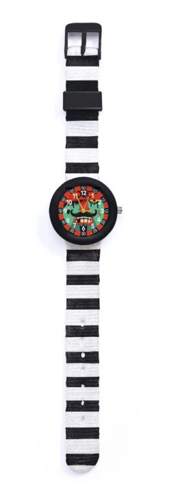 Elegante Quarzuhr mit schönem Piratenmotiv zum Uhr-Lesen-Lernen. Pädagogisch konzipierte Uhr mit zwei unterschiedlichen Zifferblättern (das eine für die Stunden, das andere für die Minuten) und dünnen Zeigern zum einfachen Ablesen der Uhrzeit. Dank des japanischen Uhrwerks Miyota 2035 bewegen sich die Uhrzeiger geräuschlos. Stoßfestes und bis zu einem Druck von 3 bar wasserdichtes Uhrgehäuse. Funktioniert mit 1 SR626SW-Batterie (im Lieferumfang enthalten).