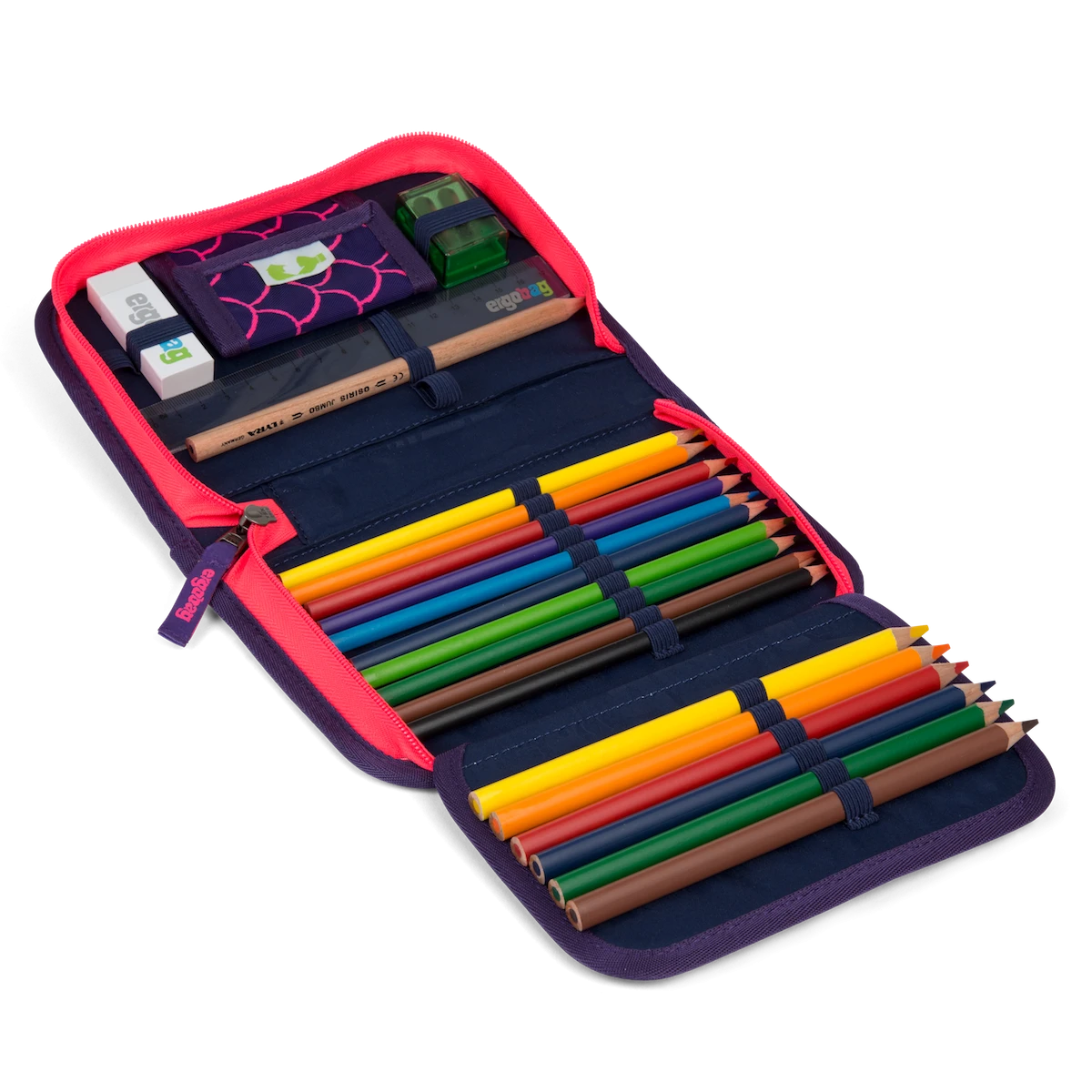 Unsere Federmäppchen sind erhältlich in den Designs der aktuellen Kollektion. Es kommt gefüllt mit einem 22-tlg. Standard-Set (Inhalt siehe weiter unten). Integriert ist ein Klarsichtfach mit Stundenplan und ein Fach zum Aufbewahren von Münzen oder sonstigen Kleinigkeiten.