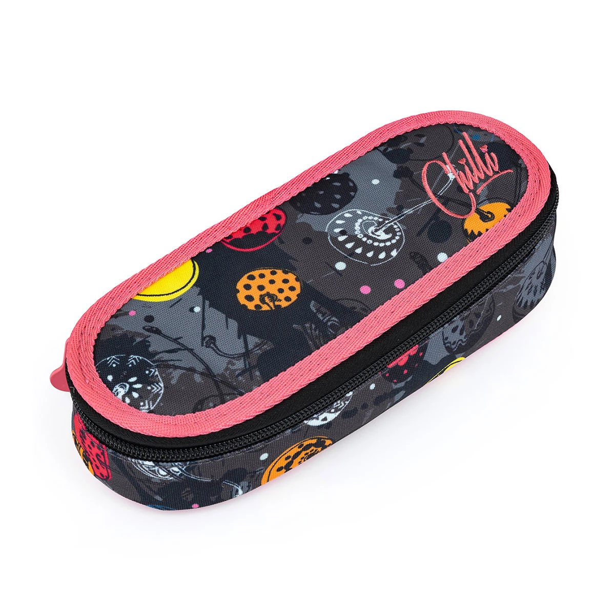 Ovales Federmäppchen für alle Bedürfnisse. Im Inneren befindet sich eine Netztasche mit Reißverschluss und einer Klappe, an der Gummibänder zur Befestigung von insgesamt neun Bleistiften und Stiften angebracht sind, die übersichtlich und griffbereit sein müssen. Der Freiraum unter der Klappe ermöglicht es Ihnen, weitere Schreibwahren frei zu platzieren – Buntstifte, Marker, was auch immer Sie brauchen.