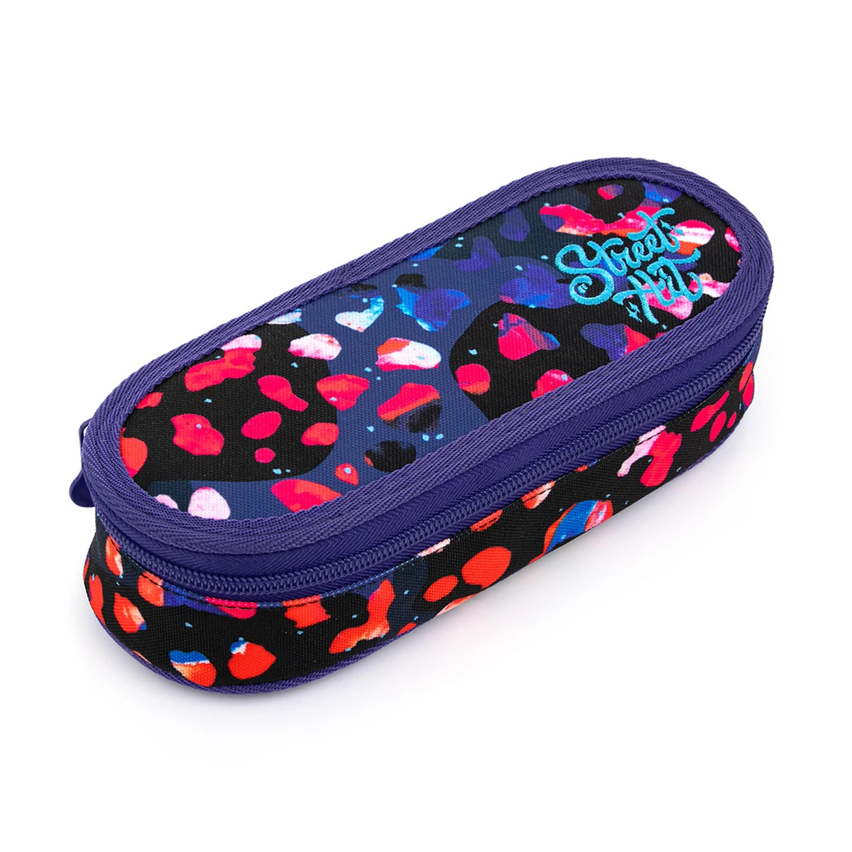 Ovales Federmäppchen für alle Bedürfnisse. Im Inneren befindet sich eine Netztasche mit Reißverschluss und einer Klappe, an der Gummibänder zur Befestigung von insgesamt neun Bleistiften und Stiften angebracht sind, die übersichtlich und griffbereit sein müssen. Der Freiraum unter der Klappe ermöglicht es Ihnen, weitere Schreibwahren frei zu platzieren – Buntstifte, Marker, was auch immer Sie brauchen.