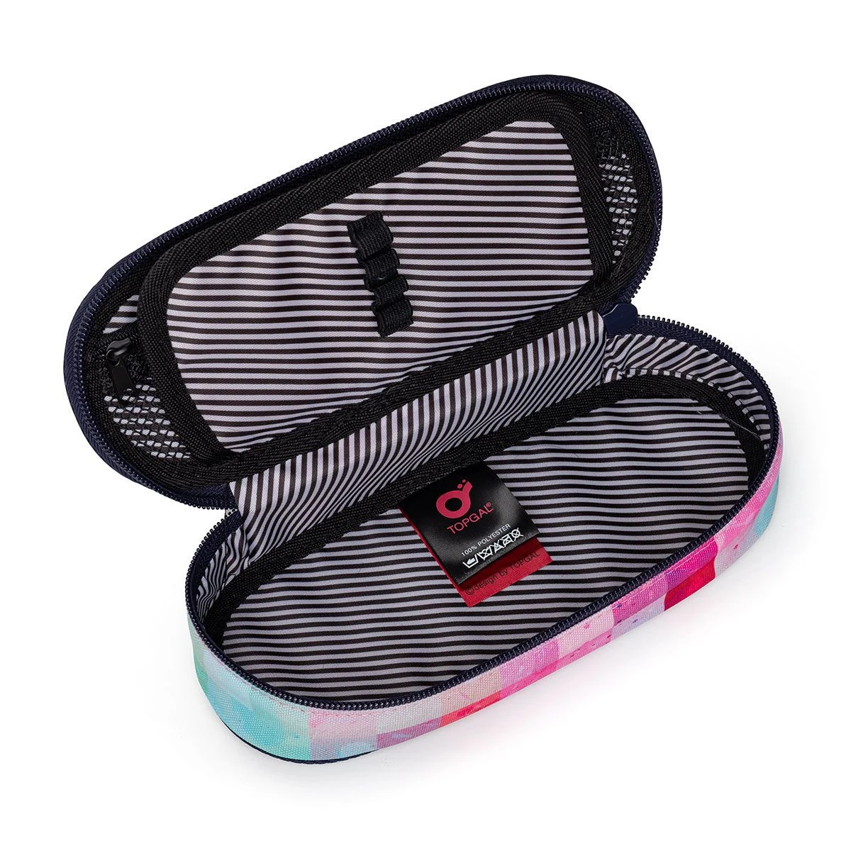 Ovales Federmäppchen für alle Bedürfnisse. Im Inneren befindet sich eine Netztasche mit Reißverschluss und einer Klappe, an der Gummibänder zur Befestigung von insgesamt neun Bleistiften und Stiften angebracht sind, die übersichtlich und griffbereit sein müssen. Der Freiraum unter der Klappe ermöglicht es Ihnen, weitere Schreibwahren frei zu platzieren – Buntstifte, Marker, was auch immer Sie brauchen.