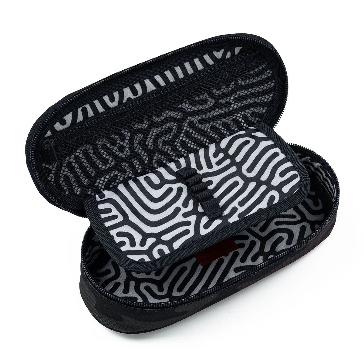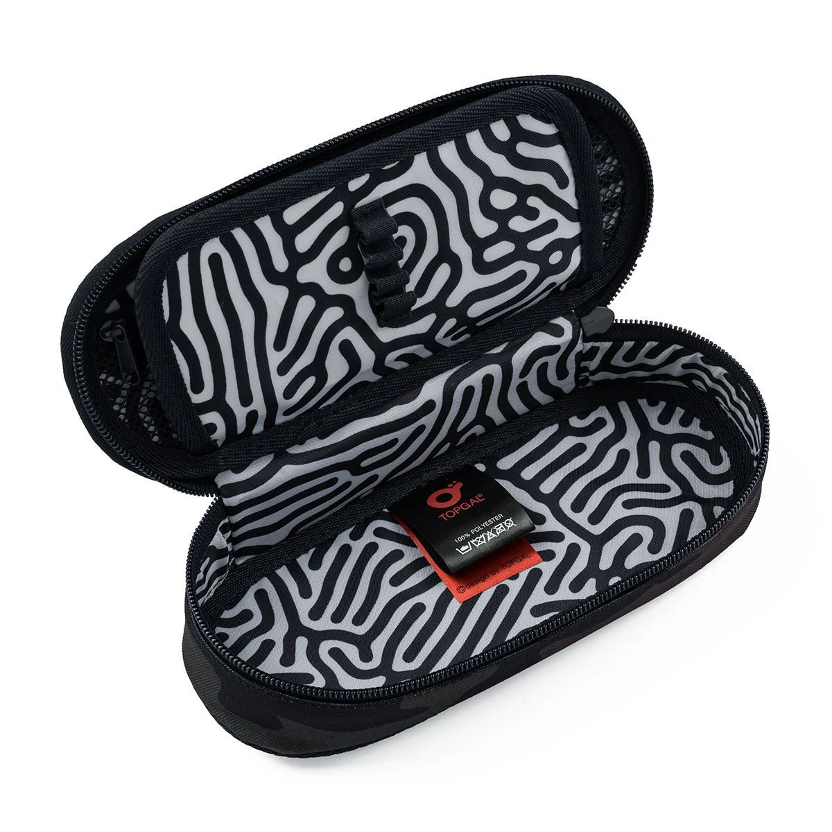 Ovales Federmäppchen für alle Bedürfnisse. Im Inneren befindet sich eine Netztasche mit Reißverschluss und einer Klappe, an der Gummibänder zur Befestigung von insgesamt neun Bleistiften und Stiften angebracht sind, die übersichtlich und griffbereit sein müssen. Der Freiraum unter der Klappe ermöglicht es Ihnen, weitere Schreibwahren frei zu platzieren – Buntstifte, Marker, was auch immer Sie brauchen.