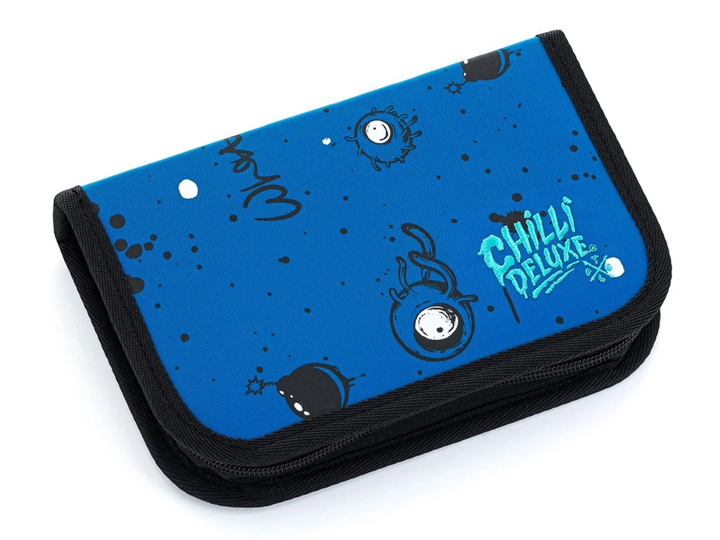 Das einstöckige Federmäppchen mit zwei Klappen ist mit 21 klassischen Gummigriffen für Buntstifte und Marker, drei breiteren Griffen für Lineal, Zirkel oder Schere und zwei größeren Griffen für Gummi und Spitzer ausgestattet. Unter der Klappe aus transparenter Folie befindet sich ein Stundenplan, der zweite wird z.B. auch für Zugbänder verwendet 🙂