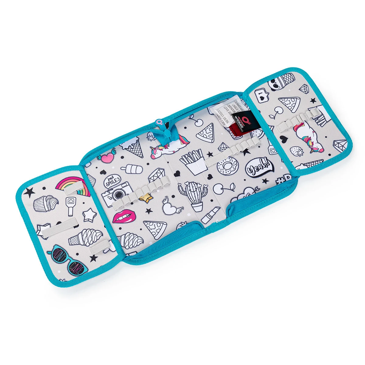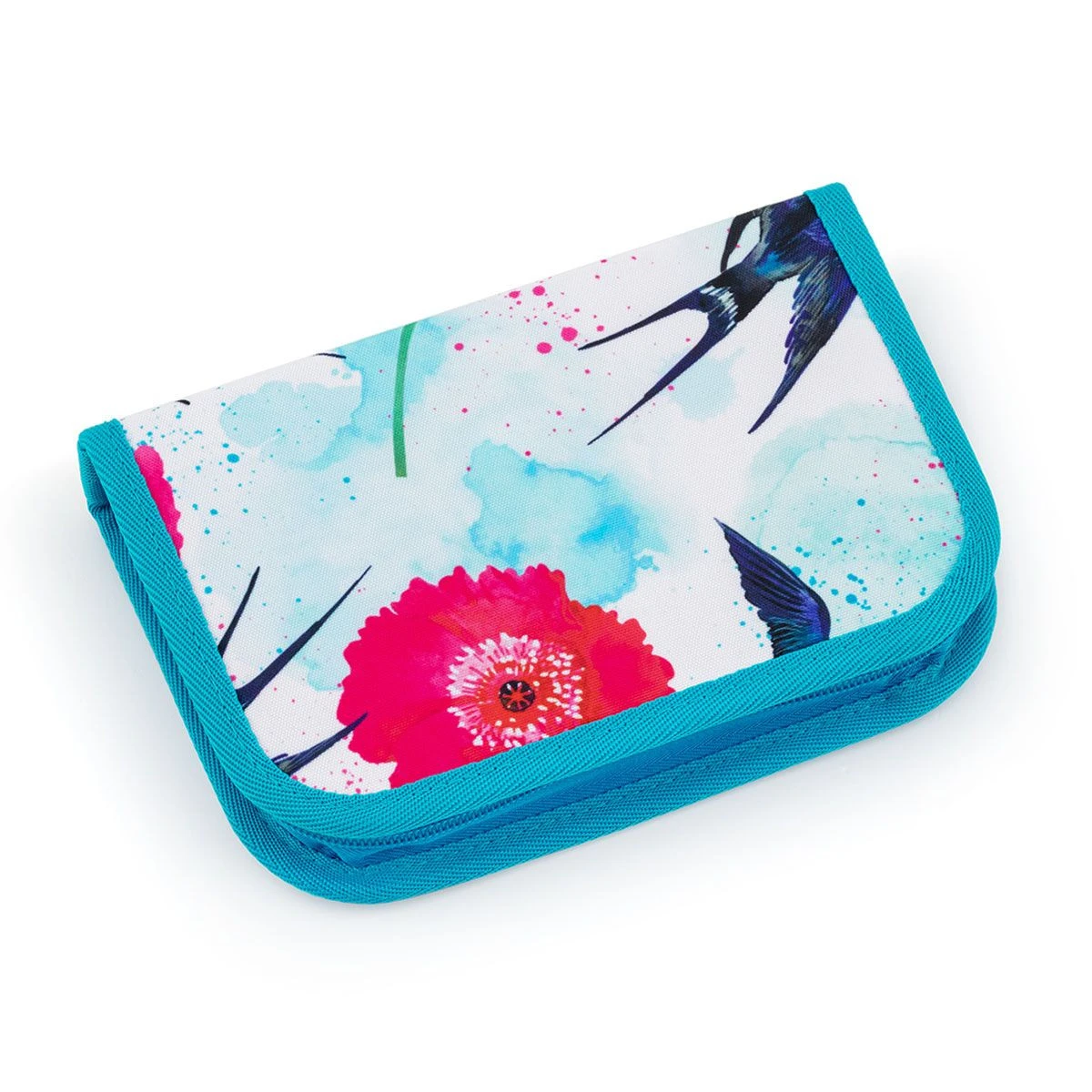 Das einstöckige Federmäppchen mit zwei Klappen ist mit 21 klassischen Gummigriffen für Buntstifte und Marker, drei breiteren Griffen für Lineal, Zirkel oder Schere und zwei größeren Griffen für Gummi und Spitzer ausgestattet. Unter der Klappe aus transparenter Folie befindet sich ein Stundenplan, der zweite wird z.B. auch für Zugbänder verwendet 🙂