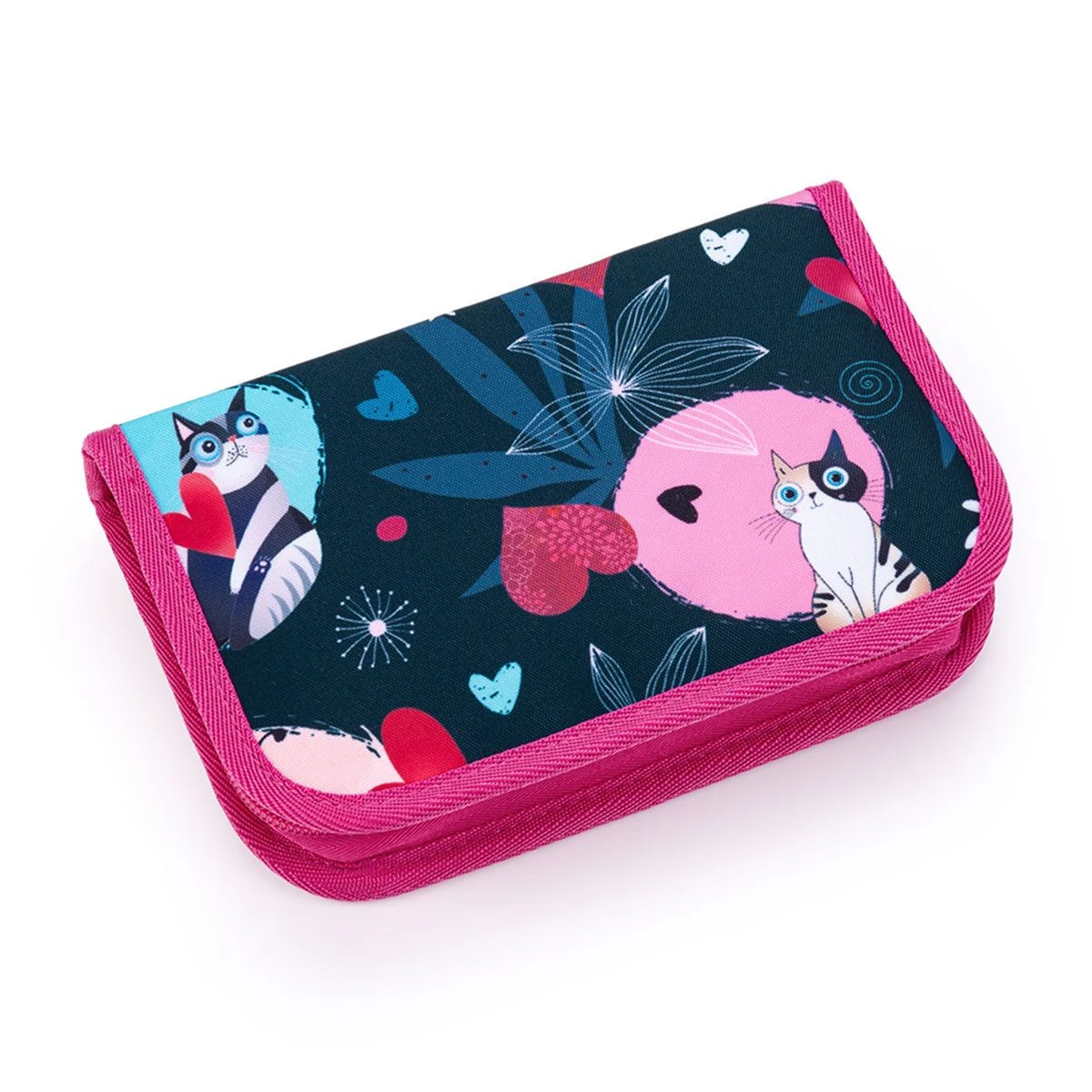 Das Dreikammermodell COCO ist ein beliebter Schnitt für kleine Mädchen in der ersten Klasse, aber auch für Schülerinnen in den oberen Klassen der Grundstufe. Die niedliche Katzenpackung in Kombination mit rosa Herzen kommt auf einem dunklen Hintergrund schön zur Geltung.