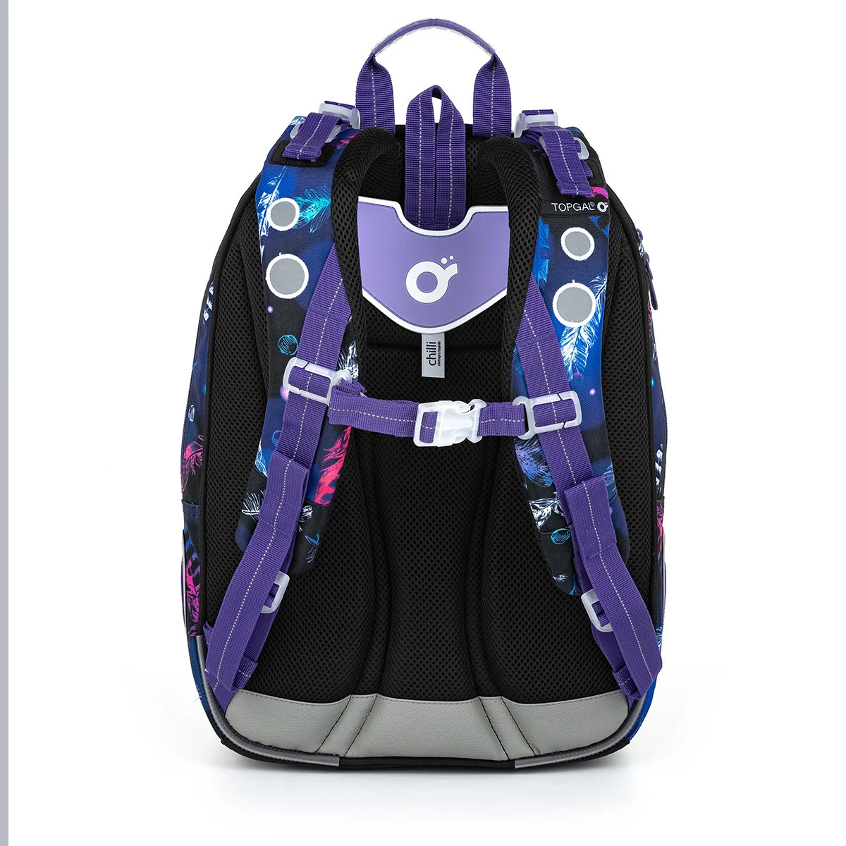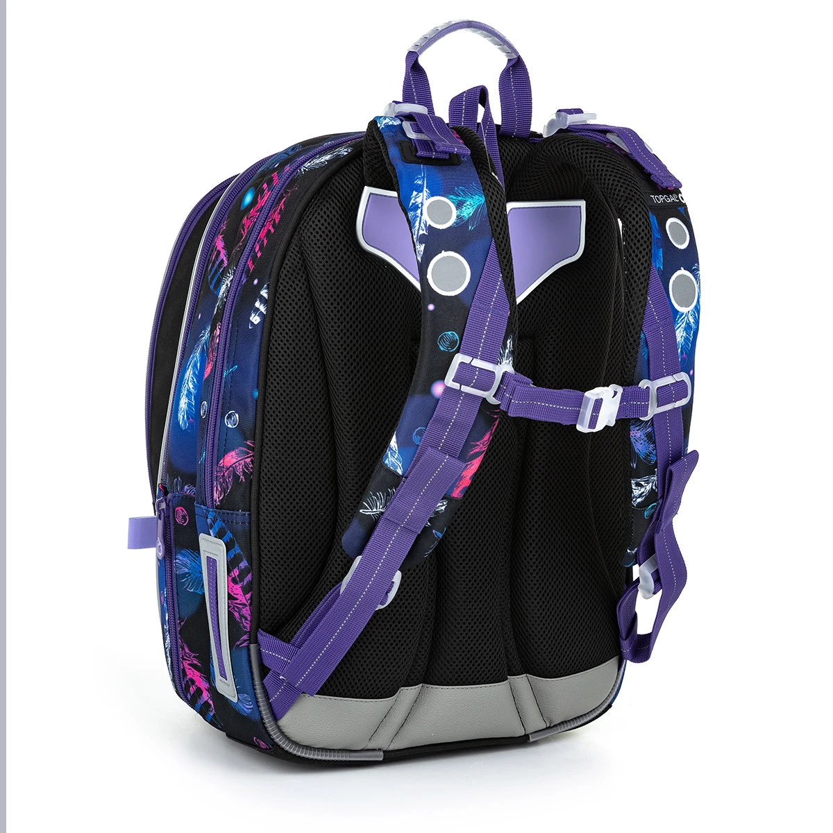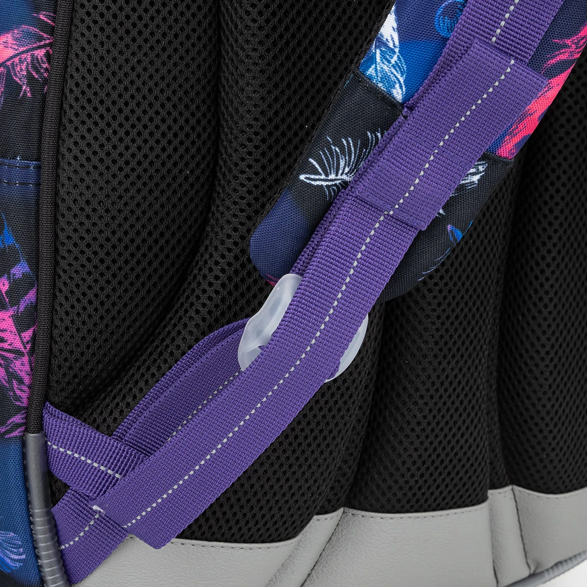 Die Rückseite des Rucksacks ist fest und mit anatomisch geformter Polsterung und Aluminiumverstärkung verstärkt. Gepolsterte Schultergurte sind ergonomisch geformt und im unteren und oberen Teil verstellbar. Der höhenverstellbare Brustgurt sorgt dafür, dass der Rucksack auch bei kleineren Jungs nicht von den Schultern rutscht.