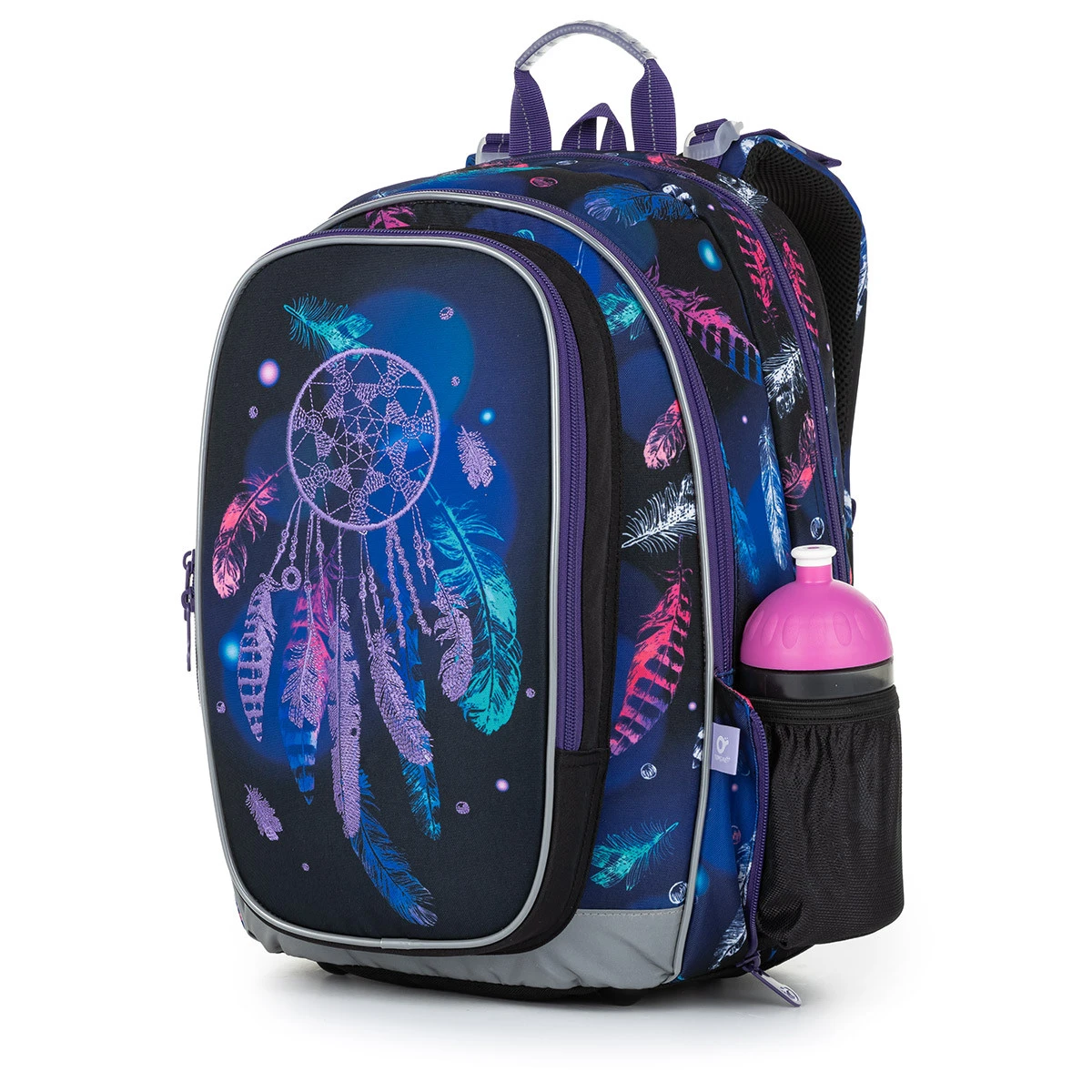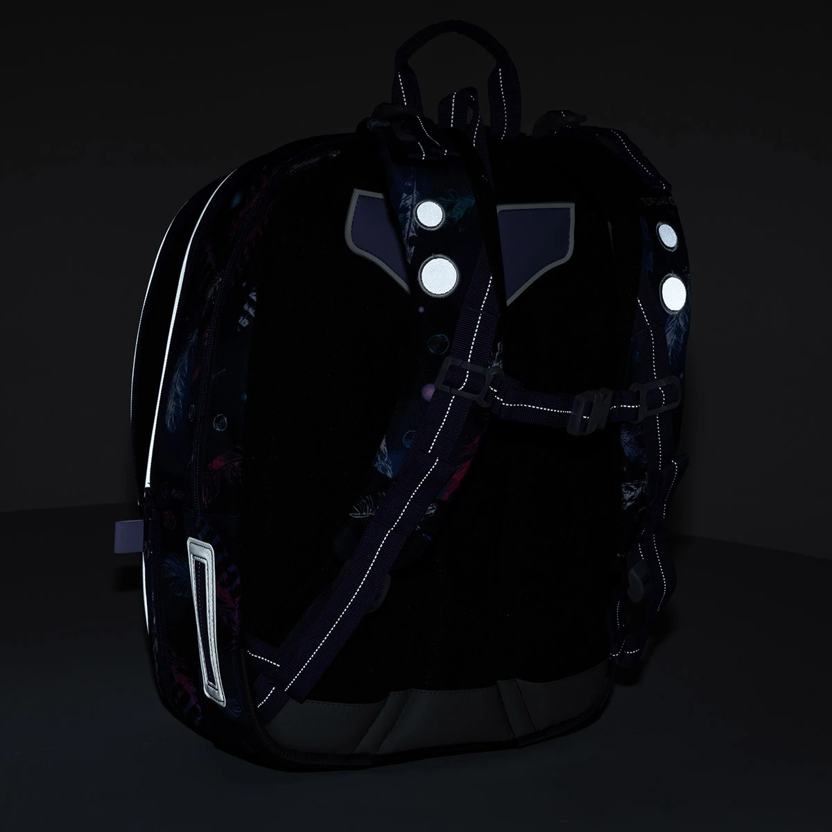 Stecken Sie die Trinkflasche in die Seitentasche, die unter dem Reißverschluss versteckt ist, des Rucksacks hinein. Auch beim MIRA-Modell haben wir auf reflektierende Flächen nicht verzichtet – Sie finden sie an den Schultergurten, der Seite des Rucksacks und dessen Vorderseite sowie in den Rändern der Vorderfächer und Tasche.