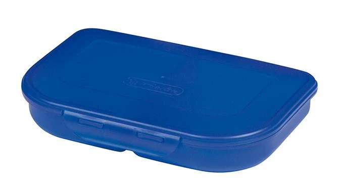 Praktische dunkelblaue Snackbox für Jungen und Mädchen nicht nur für die Schule geeignet von der deutschen Firma Herlitz mit den Maßen 23 x 15 x 4 cm. Die Kunststoffbox ist zweiteilig und durch den Klappverschluss leicht zu öffnen/schließen. Sie können sie bedenkenlos in der Spülmaschine waschen.