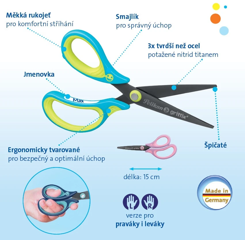 Dank der weichen ergonomisch geformten Griffzonen liegt die Bastelschere angenehm in der Hand und ermöglicht neben dem präzisen Schneiden auch verschiedene ergonomische Griffhaltungen. Die abgerundeten und spitzen Klingen sind durch ihre Titannitrid-Beschichtung besonders stoß- und kratzfest. Das praktische Namensschild verhindert, dass die Kinderscheren vertauscht werden und das lachende griffix®-Gesicht zeigt dem Kind an, ob es die Schere richtig in der Hand hält. So wird Schneiden schon für die Kleinsten zum echten Kinderspiel!