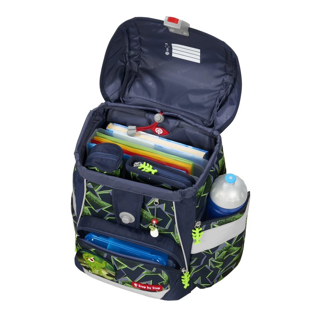 Viel Platz für Bücher und Hefte: in dem großen Hauptfach kommen alle Hefte unter. Das extra Bücherfach nah am Rücken sorgt für eine optimale Gewichtsverteilung. Fronttasche für die Lunchbox – da bleibt die Lunchbox kühl oder warm, ohne dabei in den Innenraum zu drücken. 2 nach außen wachsende Seitentaschen für Trinkflasche und Co., sie werden mit Kletteverschlus erweitert. Der Turnbeutel lässt sich einfach mit Druckknöpfen und Schlaufe amSchulranzen befestigen. So sind die Hände auf dem Schulweg frei.