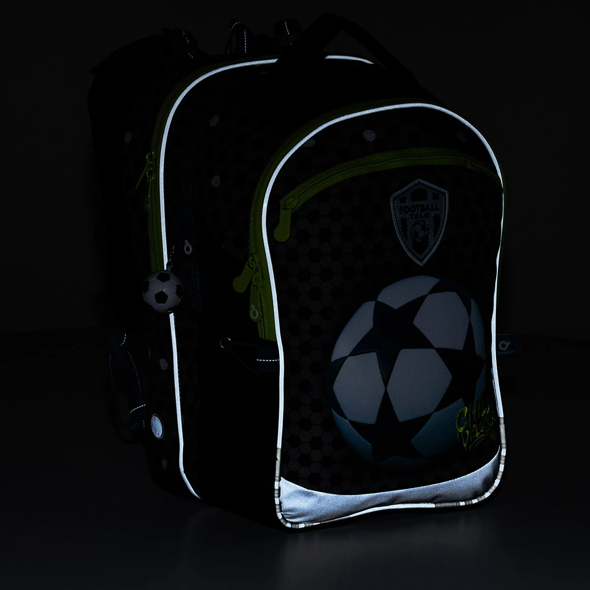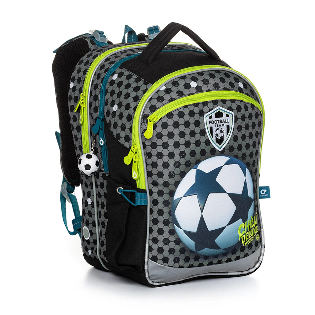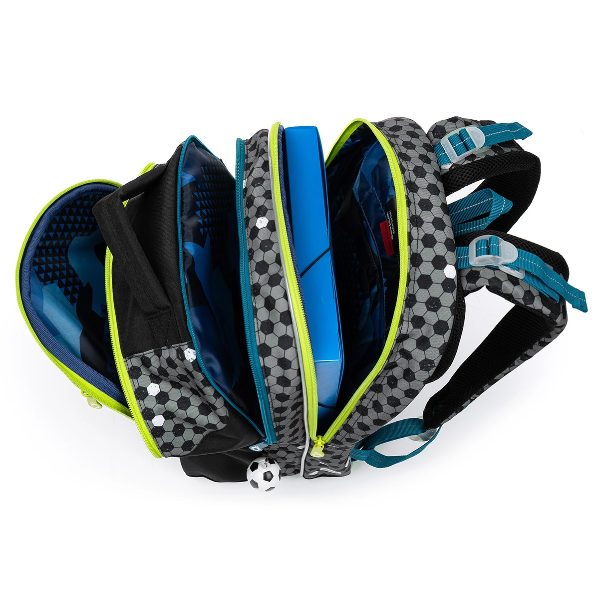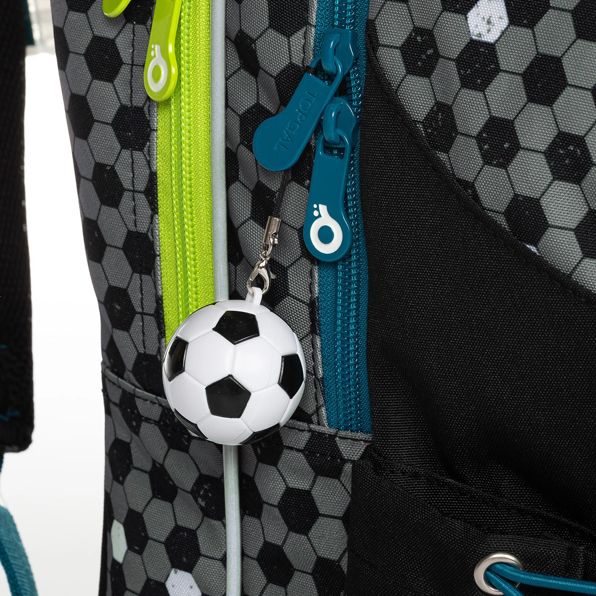 Die drei Fächer können das gesamte Lehrmaterial aufnehmen. Die hinteren und mittleren Fächer sind schmaler als das vordere Fach. In dem vorderen Fach finden Sie außerdem eine praktische Netz-Reißverschlusstasche und einen abnehmbaren Karabiner für einen Schlüssel. In der vorderen tiefen Tasche befindet sich ein Namensschild.