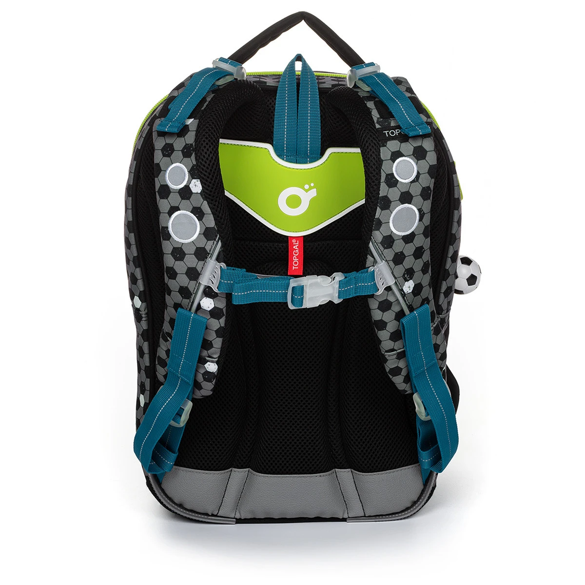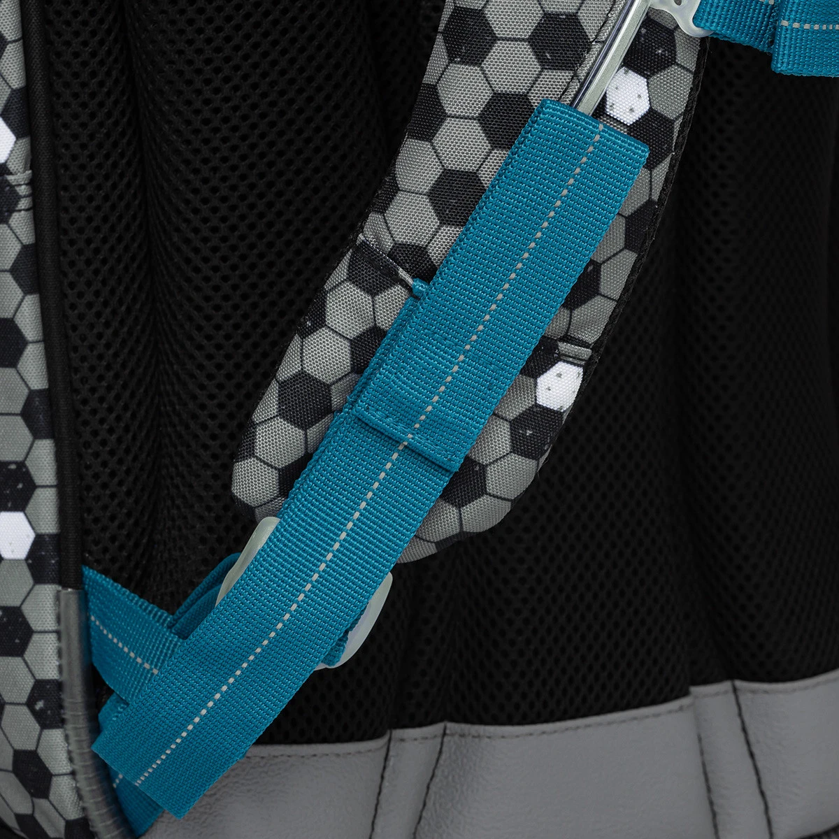 Die Rückseite des Rucksacks ist weich gepolstert, anatomisch geformt und mit einer Aluminiumverstärkung verstärkt, die die Form des Rückens in der richtigen Form hält. Auch die Schultergurte sind weich gepolstert, geformt und mit einem Brustgurt ausgestattet. Die Träger können sowohl oben am Körper als auch unten auf unterschiedliche Längen gespannt werden. Der Rucksack sollte auf dem Hüftknochen Ihres Schülers sitzen und oben nicht über die Schultern reichen.