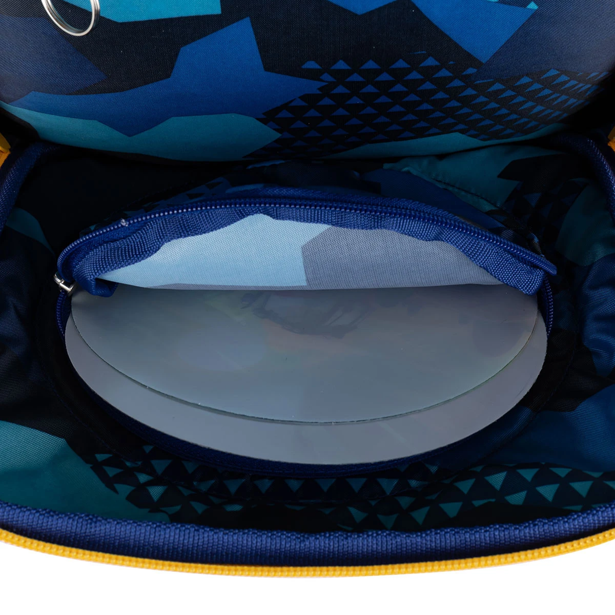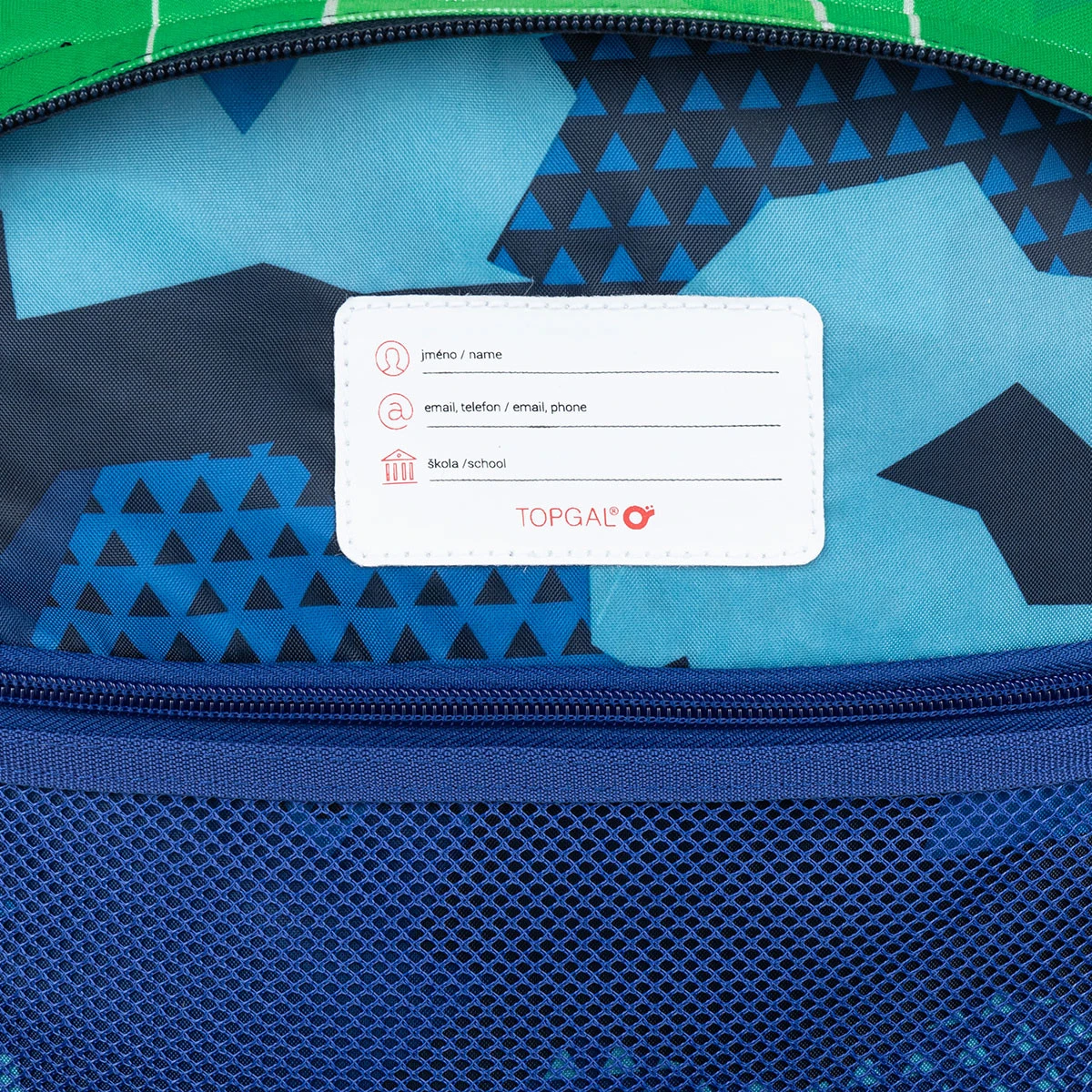 In dem vorderen schmaleren Fach finden Sie eine kleine Netztasche mit Reißverschluss und Namensschild.