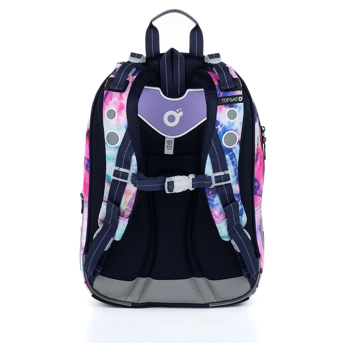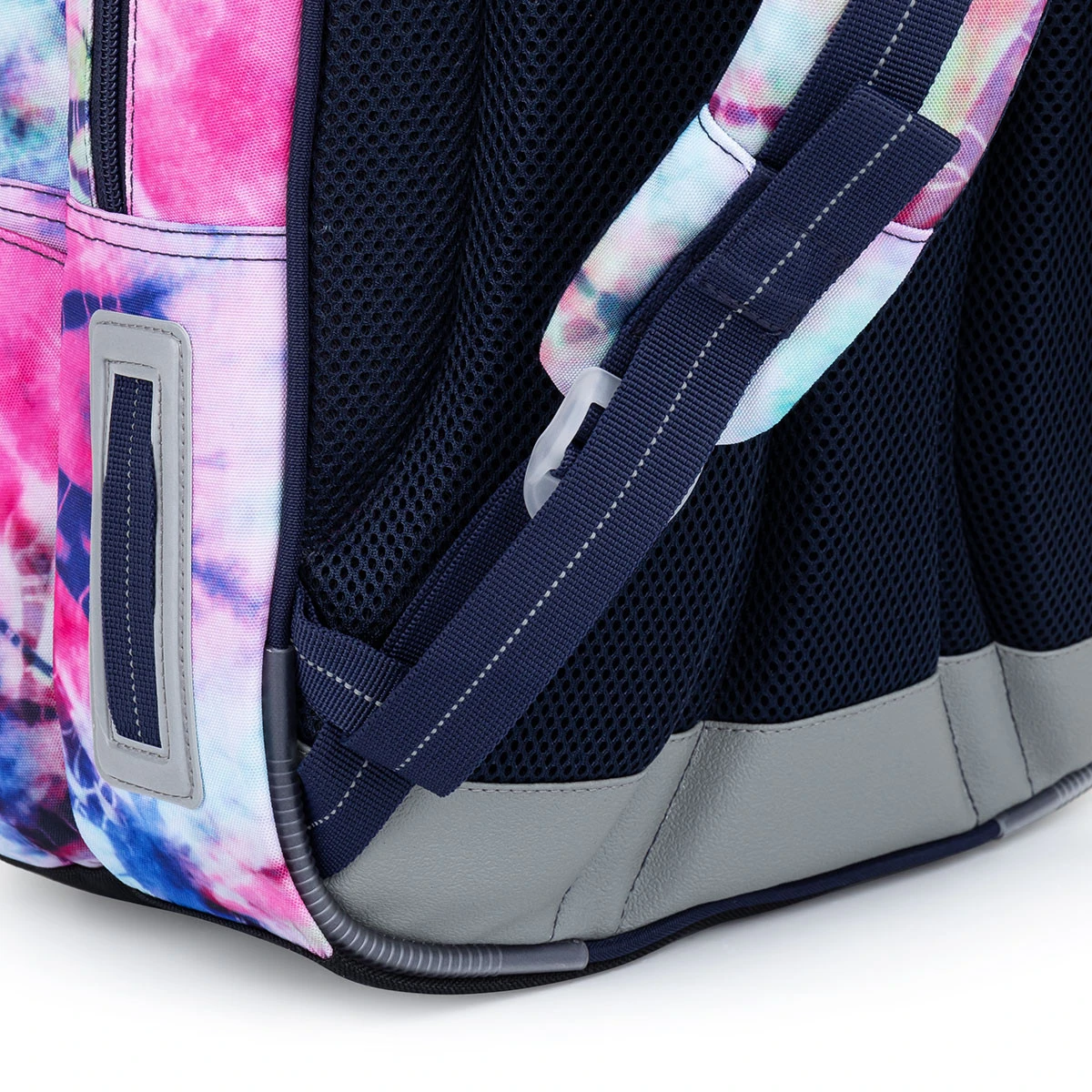 Der Batik-Doppelkammer-Rucksack ist für Mädchen ab 125 cm geeignet. Er ist größer als die anderen, daher empfehlen wir ihn ab der zweiten Klasse. Trotz seines dezenten Schnitts ist der KIMI-Rucksack recht sperrig – er misst 43 cm in der Höhe, sein Volumen reicht also mindestens für die fünfte Klasse. In seinen zwei voluminösen Fächern kann eine wirklich große Menge an Lernstoff untergebracht werden.
