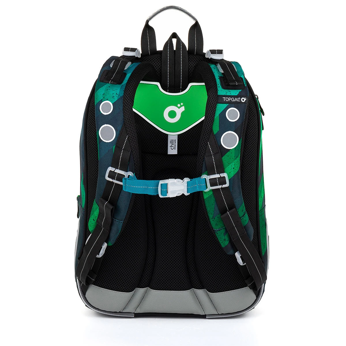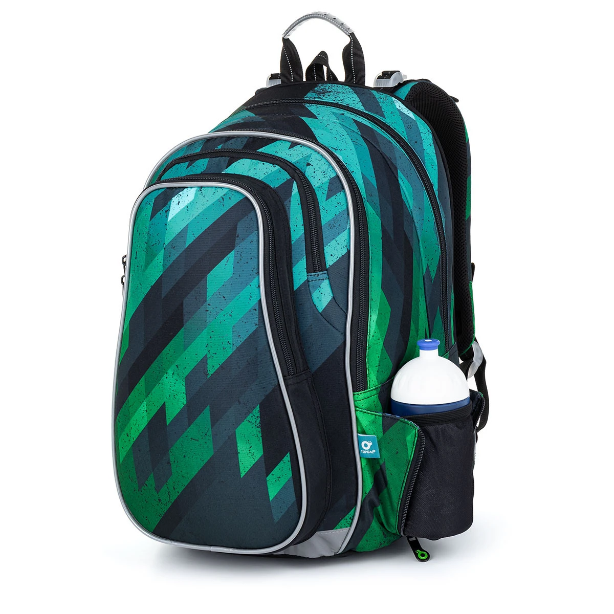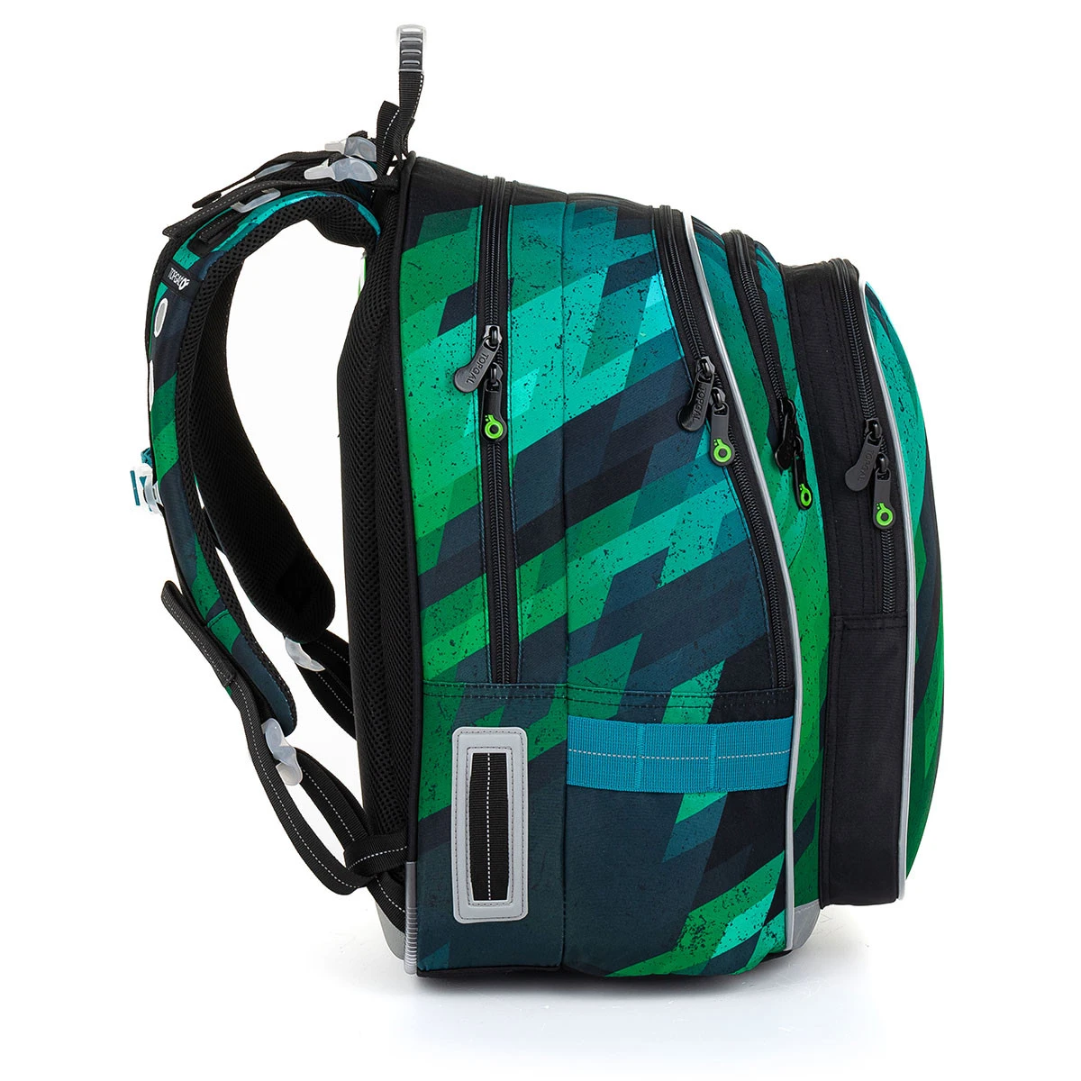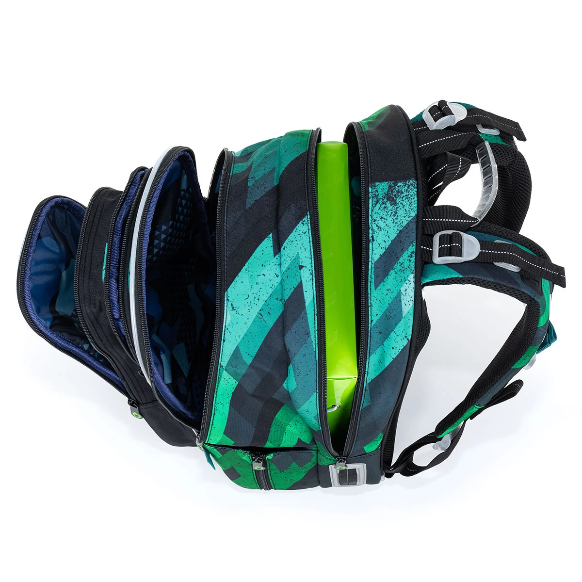 Der grün-blaue Zweikammer-Rucksack kann von allen Schulkindern ab einer Körpergröße von 125 cm getragen werden. Er ist der Goliath unter den Schulrucksäcken. Der Rucksack wiegt etwas mehr als 1 kg. Eltern und Schüler werden den starken, anatomisch geformten Rücken mit Verstärkung, zwei Fächern und zwei tiefen Taschen zu schätzen wissen. Das Rückenfach des Rucksacks ist schmaler. Er ist ideal für den Transport von schweren Lehrbüchern oder Notizbüchern. Die vordere Kammer ist die breiteste und verfügt über eine praktische Netztasche mit Reißverschluss. Die tiefe Tasche zwischen der vorderen Kammer und der Tasche auf der Vorderseite des Rucksacks hat einen schmaleren Eingang, perfekt für ein PENN 23018 Federmäppchen im gleichen Design oder eine Snackbox. In die Seitentasche passt eine 0,5-Liter-Flasche.