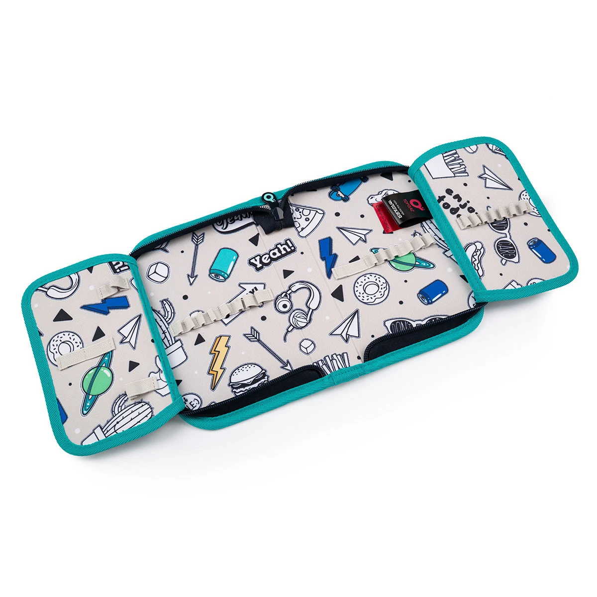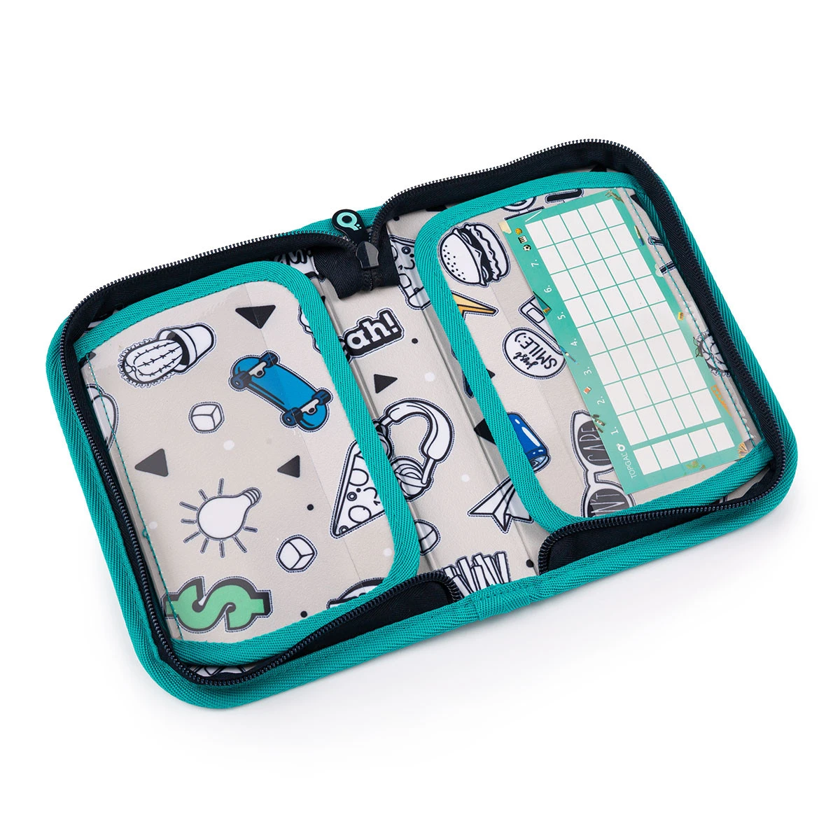 Das hintere Fach des Rucksacks ist schmaler und enthält eine kleinere Netztasche mit Reißverschluss. Das vordere Fach ist etwas breiter, geräumig und wird durch eine gepolsterte Trennwand in zwei Bereiche unterteilt. Sie können Lehrbücher und Hefte oder Lernen und Snacks bequem trennen. Sie können Ihre Snackbox aber auch in der tiefen Vordertasche unterbringen, die auch ein Namensschild und einen abnehmbaren Schlüsselclip enthält.