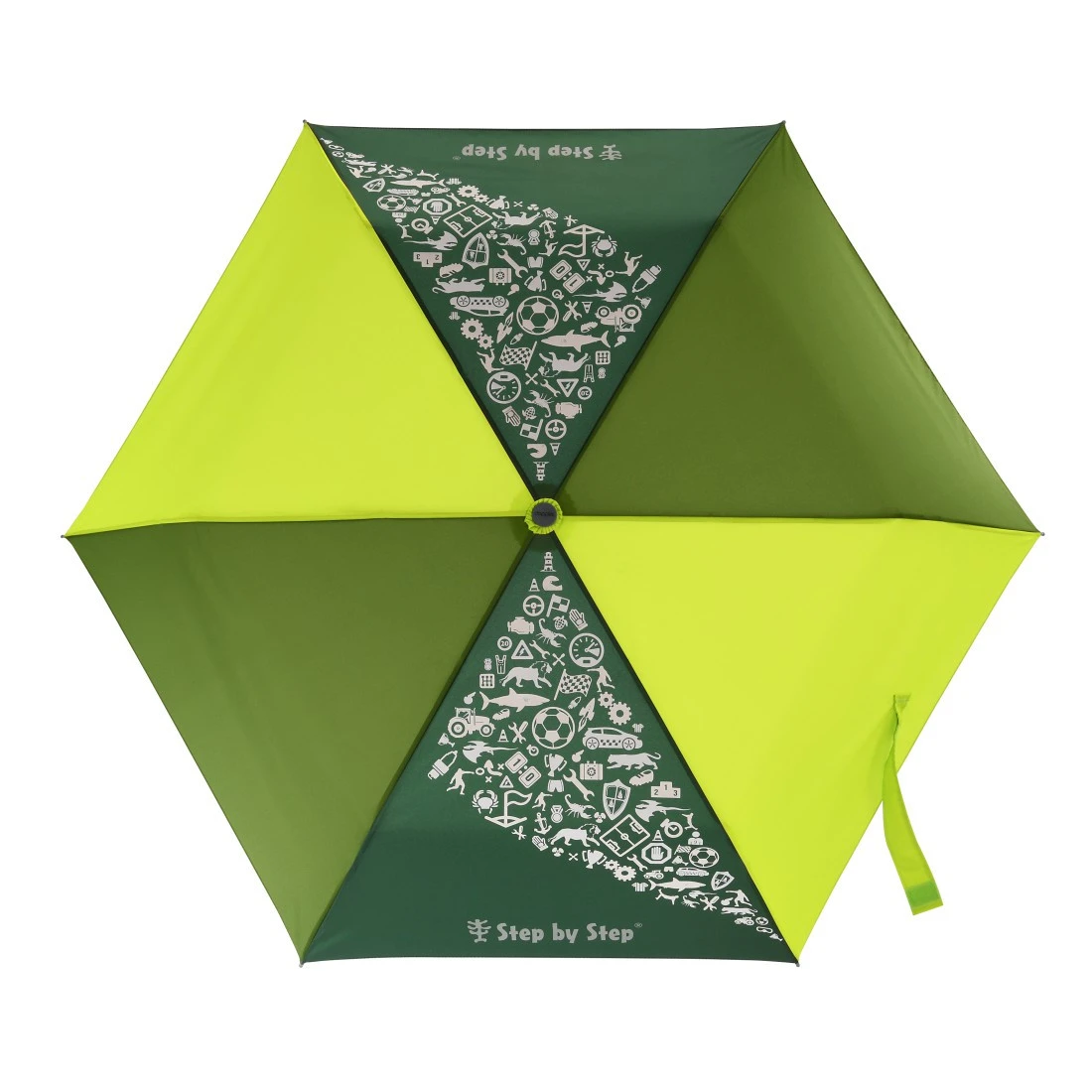 Kinderregenschirm der Marke Doppler mit magischem Regeneffekt – die weißen Bilder auf dem Schirm werden bei Kontakt mit Wasser farbig. Für zusätzliche Sicherheit ist der Schirm mit reflektierenden Step by Step-Schriftzügen auf dem Dach versehen. Der Schirm ist klappbar und kann manuell bedient werden. Er besteht aus einer stabilen und haltbaren Aluminium- und Glasfaserkonstruktion sowie Drähten mit Kunststoffenden. Die Aluminiumstange ist ca. 50 cm lang.