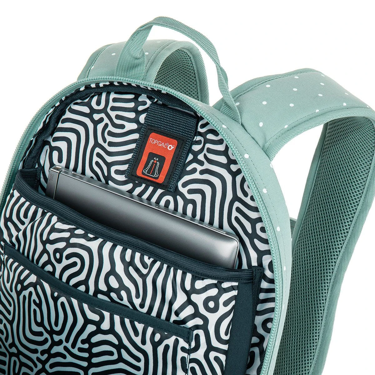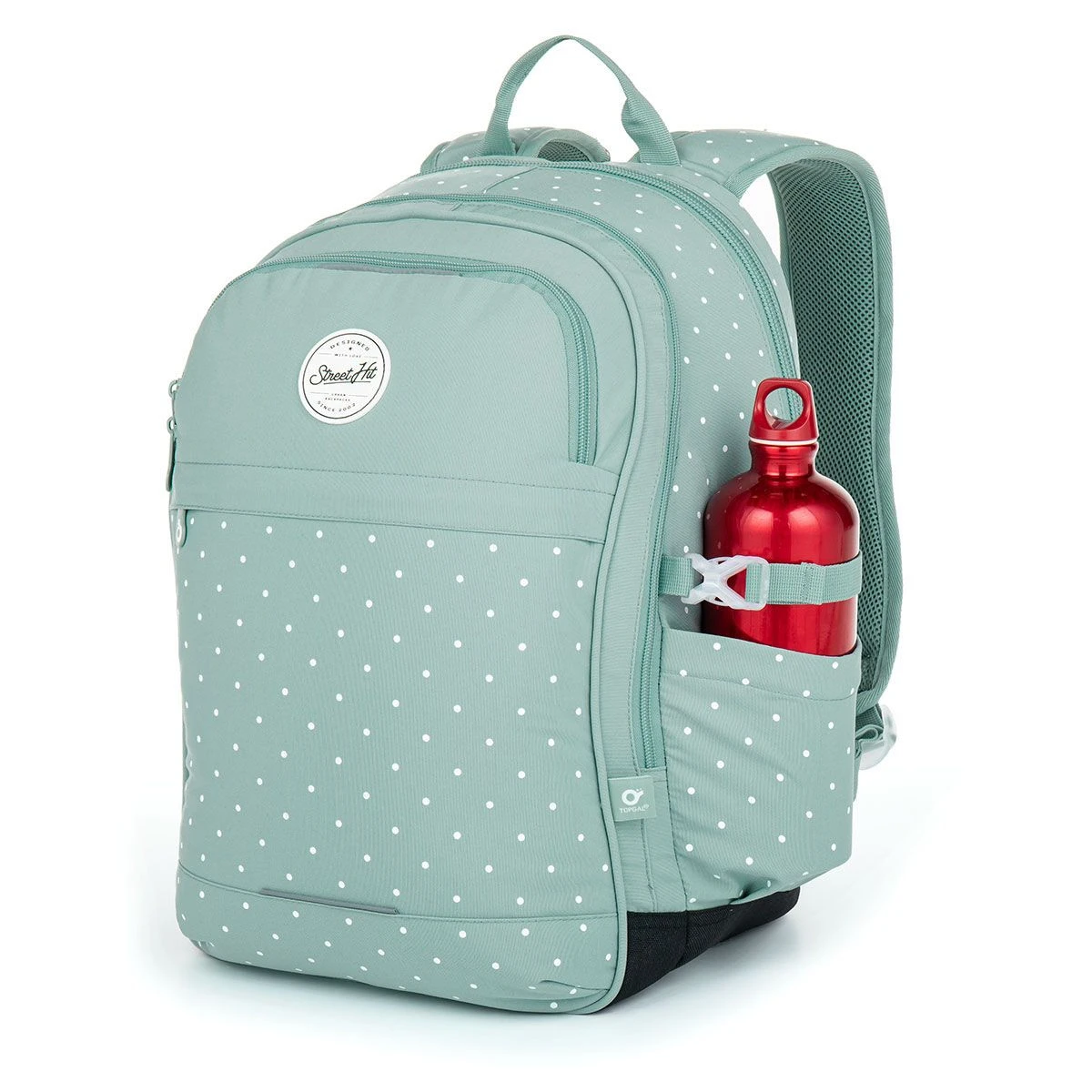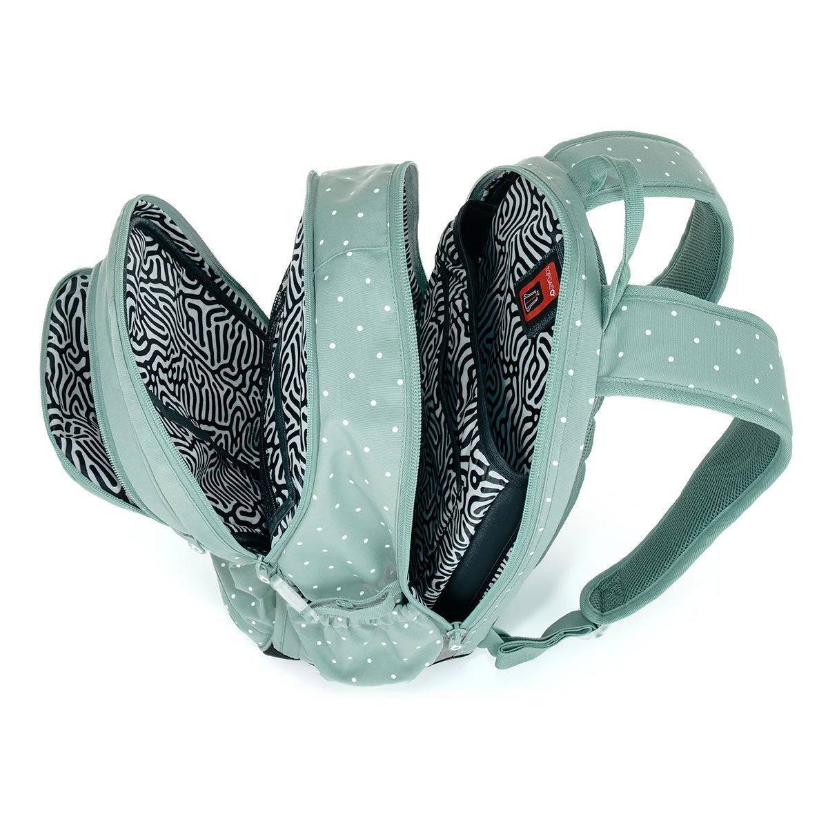 Der voluminöse Zweikammer-Rucksack mit Punktmuster und stylischer Applikation überzeugt jedes Teenager-Mädchen, das auffallen will. Der Rücken des Rucksacks ist gepolstert, anatomisch geformt und dank der leichten Aluminiumverstärkung stabil. Im Inneren des Rückenfachs befindet sich ein gepolstertes Fach für Laptop und Tablet sowie ein weiteres, kleineres Fach für ein Handy oder eine Powerbank.