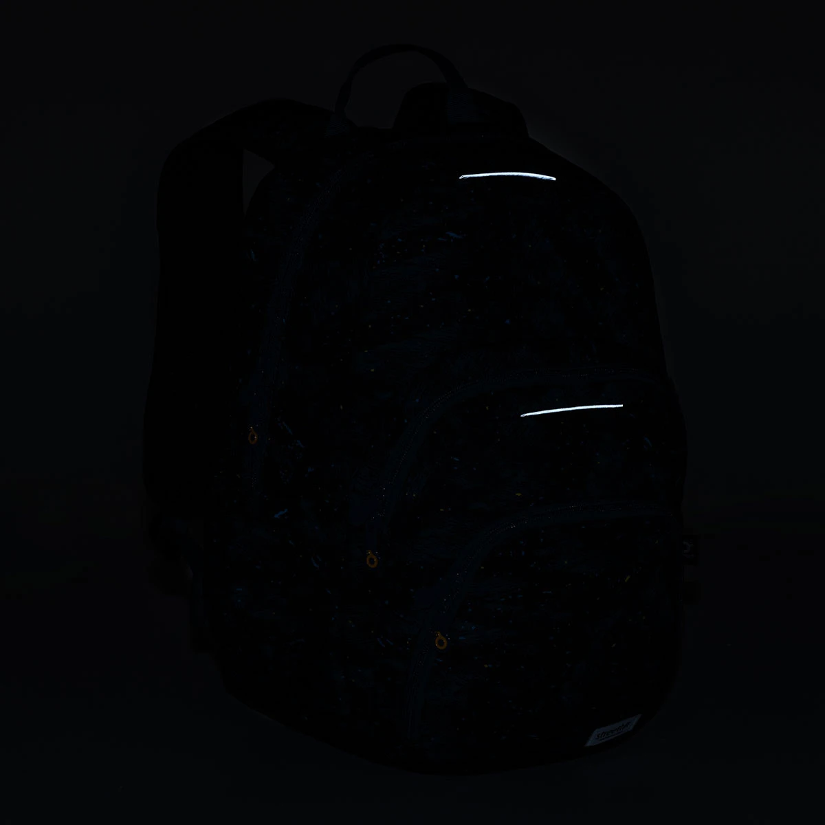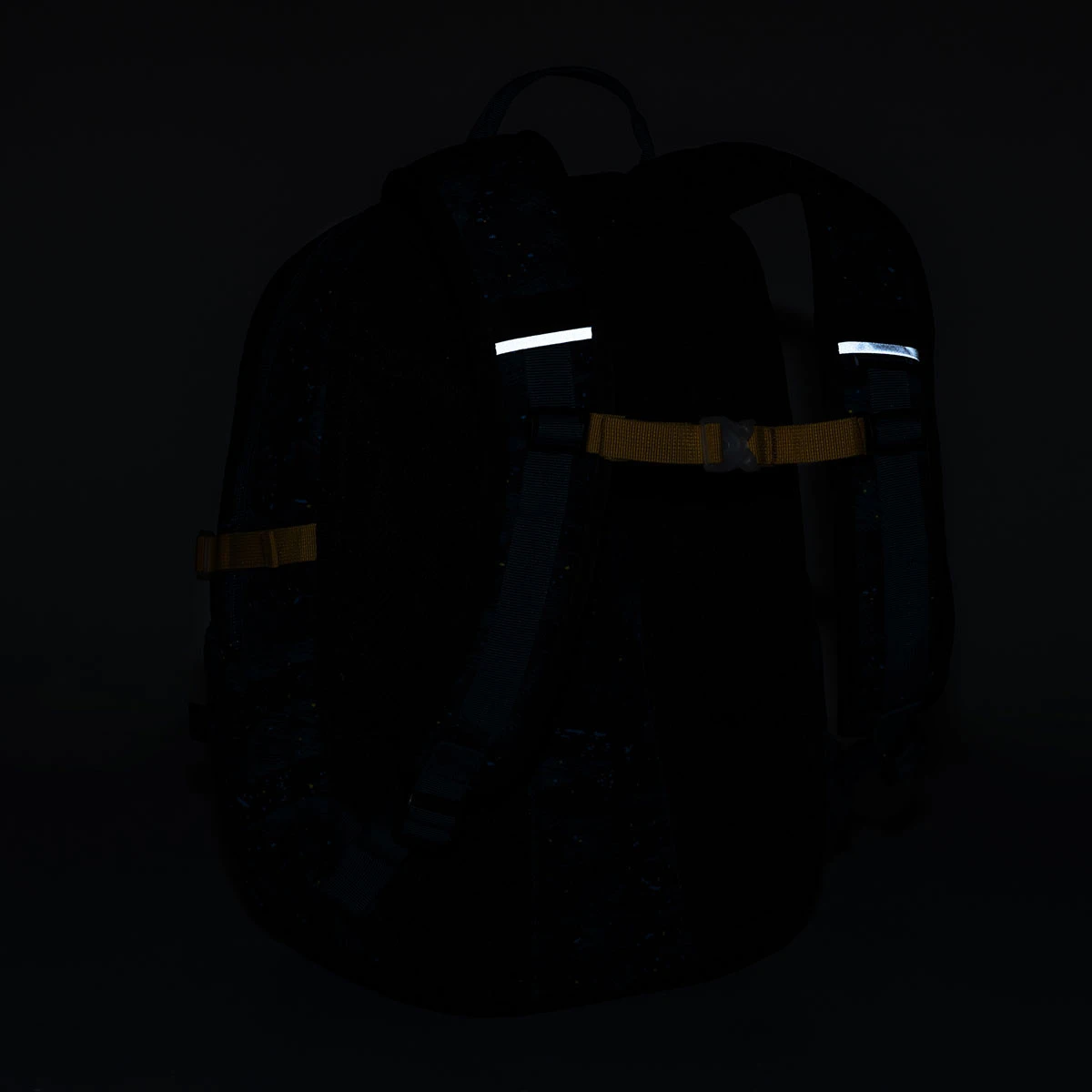 An den Seiten des Rucksacks befinden sich zwei kleinere Taschen. Eine davon ist mit einem Kompressionsriemen ausgestattet, so dass man eine 1,5-Liter-PET-Flasche hineinstellen kann. An der Vorderseite des Rucksacks und an den Schultergurten sind reflektierende Elemente dezent eingearbeitet. Der Rucksack hat eine Regenhülle sowie einen Boden aus robustem, wasserdichtem TOPDURA-Material.